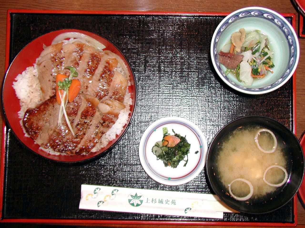 なのでここでは涙を呑み、とりあえず牛肉メニューで安いもので我慢することにする。参加したメンバーの誰も、「米沢牛」メニューを頼む人はいなかった。 で、多くの人が頼んだ「ステーキ丼」は¥2,205。濃厚な味わいを期待したけど、その味は至ってシンプルだった。よく言えばシンプル、悪く言えば「あまり味がない」。マズいわけではない。けどおいしくはない。せっかく行って食べたのになんだけど、これなら町の食堂のステーキ丼などの方が数段おいしい。とても2千円以上するものとは思えなかった。 「出発は午後2時ですよ〜」とのお達しがM.I 原氏からあったので、食後はめいめいに時間を過ごす。食事はちょっぴり残念だったけど、せっかく来たんだ、ここで一枚写真を撮っておこう。 写真を撮り終え、出発準備。この先少し走ったところにある道の駅【田沢】で食後の休憩をする、という。食後の睡魔と闘わなくて済みそうなので、この休憩予定は嬉しいところだ。PM2:05、【上杉城史苑】をあとにする。