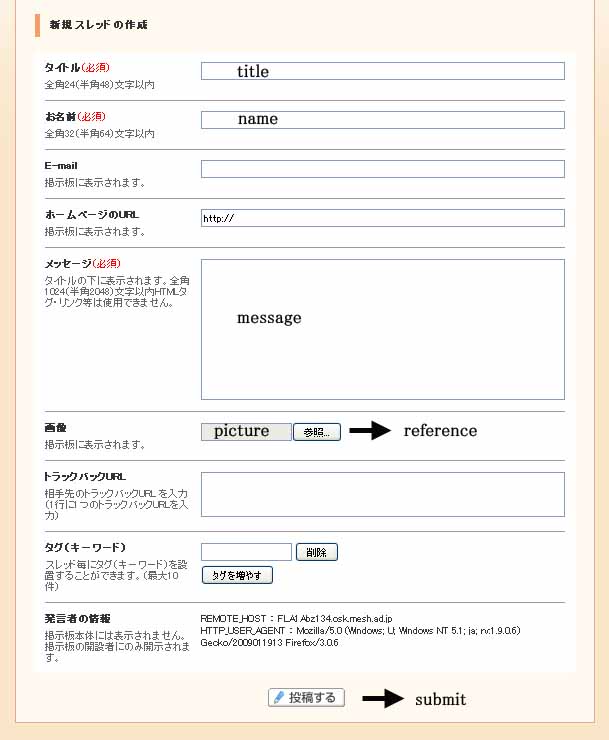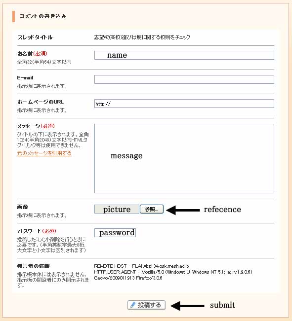 - message: indispensable. 2048 characters or less. If you show URL of a page in the message, it is automatically linked to the page after sumitting the message.