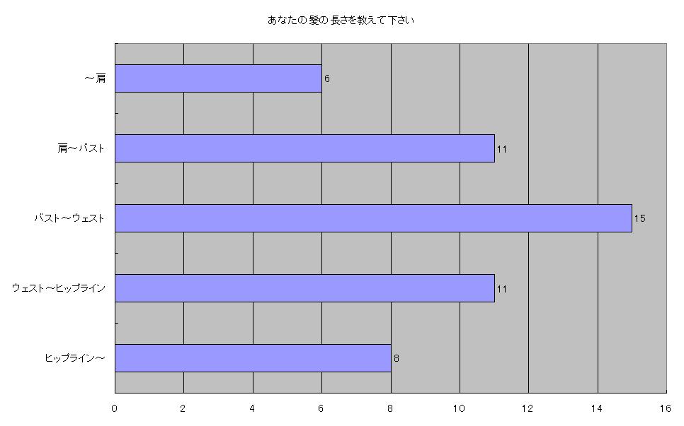 予定より早いですが、終了しました。 第1問 「普段の髪と頭皮に対する紫外線対策としてどんなことをやっていますか?」 皆さん普段からいろいろ気を付けておられるんですね。 帽子ですが、蒸れると頭皮に良くないので、通気性のいいものを選ぶといいと思います。 椿油を普段から使っておられる方が多いのにも驚きました。 他の場所でのアンケートでは全く違った結果が出ると思います。 第2問 「海やプールに行くとき、髪の傷みを少なくするためにどんなことをやっていますか?」 「海やプールには行かない」が断然トップ。そりゃそうだ。これが究極の対策です。 第1問では帽子をかぶると答えた人は多かったのに、 第2問でスイミングキャップと答えた人はは少ないですね。特に紫外線対策には スイミングキャップは効果があるように思うのですが、何か使わない理由があるのでしょうか? 「洗い流さないトリートメント」は化粧品メーカーのサイトに書いてあった対策です。 トリートメントをした後洗い流さずにその上からスイミングキャップをかぶる、ということです。 「その他」で、髪を水に浸けない、という回答が3つもありました。 これはぼくの回答例設定に問題がありました。 第3問 「海やプールに行った後のヘアケアを教えて下さい」 これについては、普段通りのヘアケアをしておられる方が結構多いようですね。 今回は投票総数は61で、そのうち無効票が10です。 もしよかったら皆さんの感想もお聞かせ下さい。新規テーマも常時募集中です。