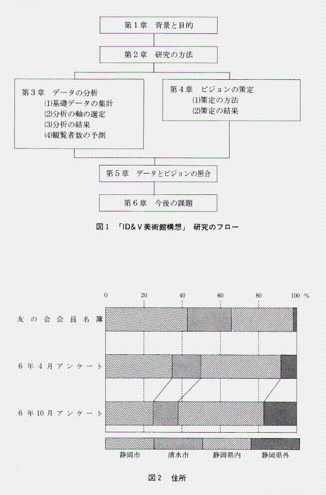 次に美術館のビジョンを定める。例えば、多様化したニーズを「県民アンケート」等により集約し、有識者による専門委員会等にて静岡県として目指すビジョンを策定すればいいのであるが、本研究においては時間と費用がかかりすぎる。そこで、現場に勤務する職員等によるアンケート及び聞き取り調査により、仮のビジョンを策定することにする。対象となる職員等については、総務課、学芸課だけでなく、できるだけ観覧者の意見を代弁できるように、最も身近な立場にあるミューズスタッフ(嘱託員)から集める。また、その際、現場により近い立場で働き、柔軟な発想が期待できるという意味から、勤務年数1〜6年の主任未満の者で、日頃「こうなったらいいなあ」と積極的に考えている人を対象とする。それから、ビジョンの目標時期については、ある程度現実にとらわれず、自由な発想が期待できるという意味から、「10年後」に設定することにする。(第4章ビジョンの策定)