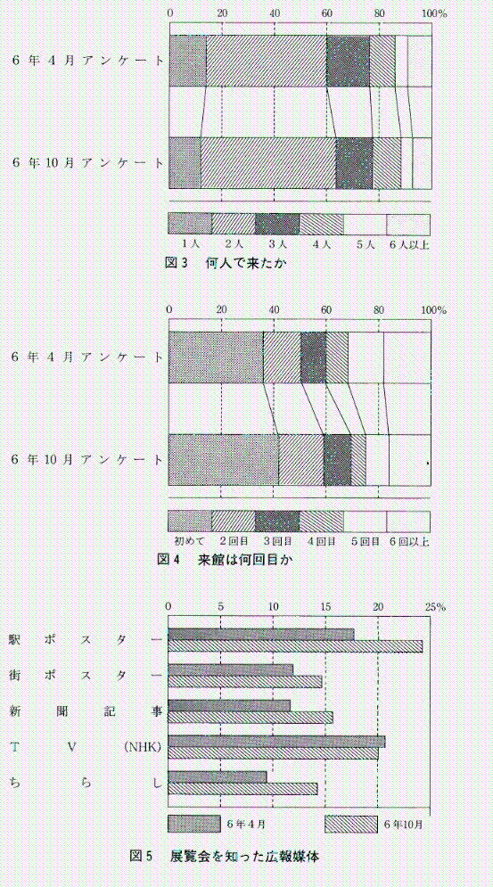 平成6年4月5日(火)から17日(日)の12日間、展示室の出口の机に用紙を置き、その場で回答してもらった。有効回答人数は、 328人、女性は男性の2倍であり、平均年齢は男性の方が 2.5歳ほど高い。また、住所は「静岡市と清水市」、人数は「2人で」、回数は「初めて又は2回目」がそれぞれ全体の1/2を占める(表3、図2〜4)。