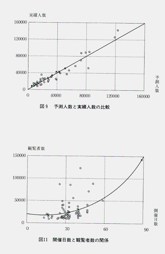 そして、これまでは、過去の経験等から直感的に観覧者数を予想していた。しかし、開館(昭和61年度)〜平成6年度の全65回展覧会観覧者数データのうち、観覧者数は、相関係数(注1)の大きさから、その開催時期、開催日数とやや関連があることがわかる。また、最初の日曜日の観覧者数とはかなり関連があることがわかる(表4)。さらに、開催時期、開催日数及び最初の日曜日の観覧者数による重相関係数(注2)は、 0.960であり、重回帰分析(注3)を用いることによって観覧者数の予測が可能になってきたと考えられる。実際に、平成6年度の6つの展覧会について予測値と実績値を比較してみると、近い数値が出ていることがわかる(表5)。また、全65回展覧会の予測人数と実績人数の関係をグラフ化すると図9のようになる。展覧会ごとの特殊事情はあるものの、そのことを考慮に入れさえすれば、この重回帰分析を用いた予測は充分に実施する価値のあるものであると考える。