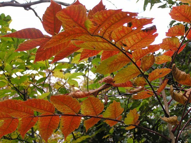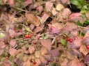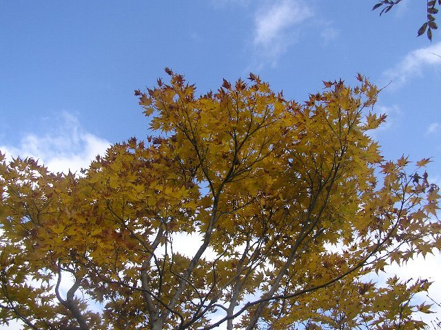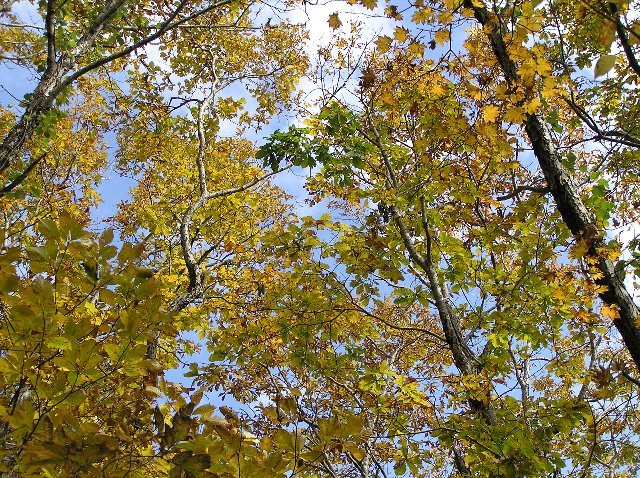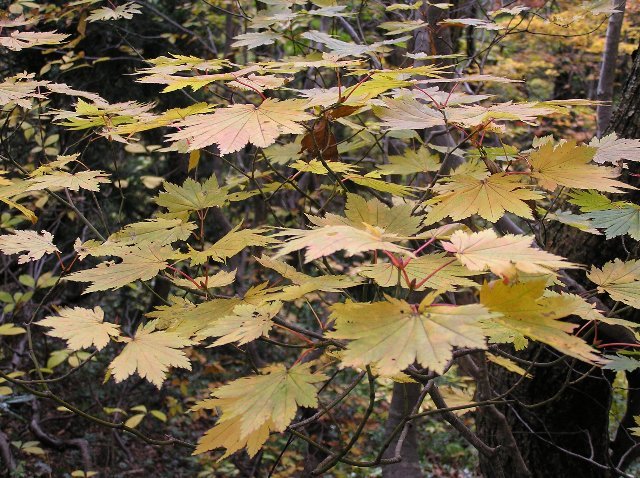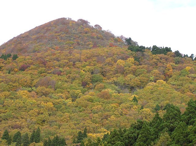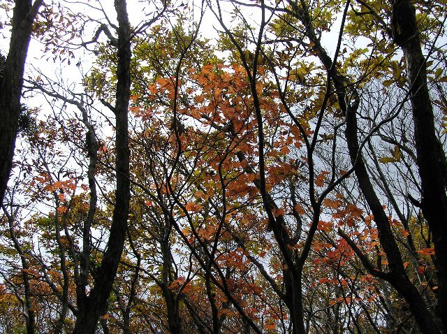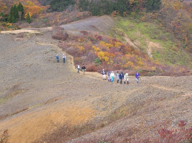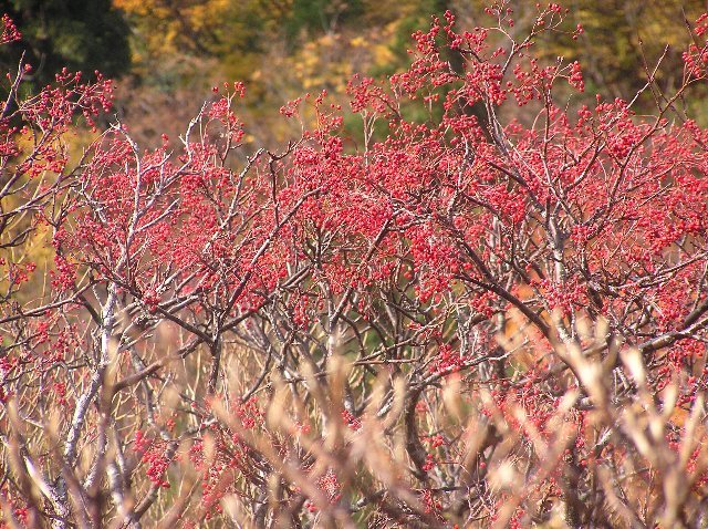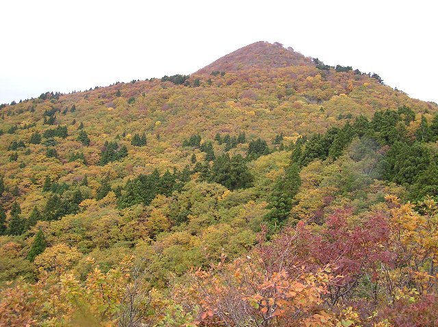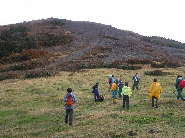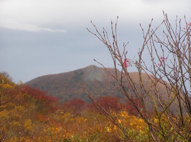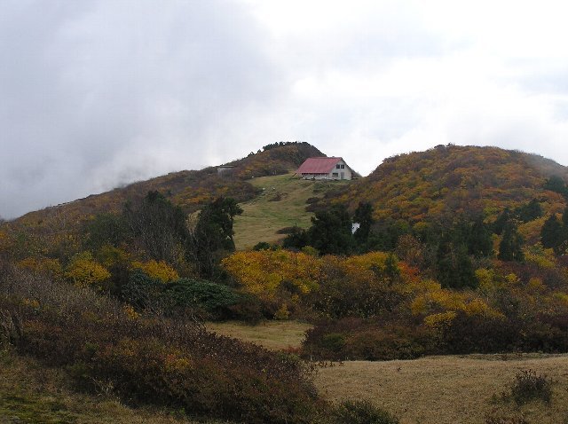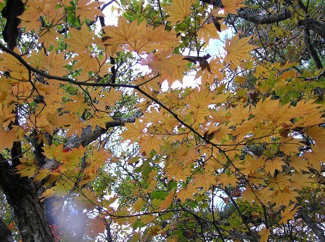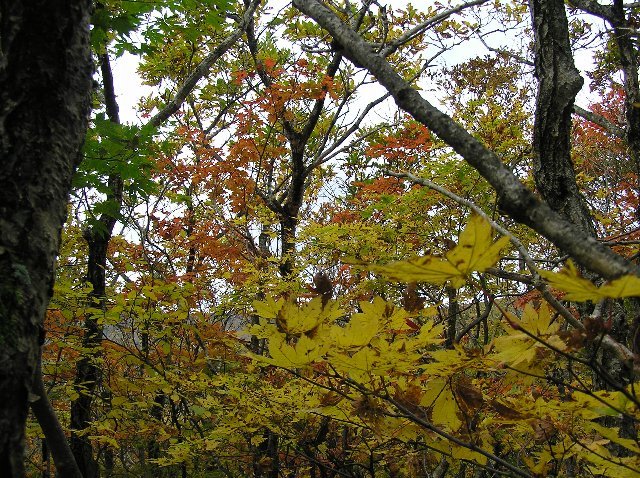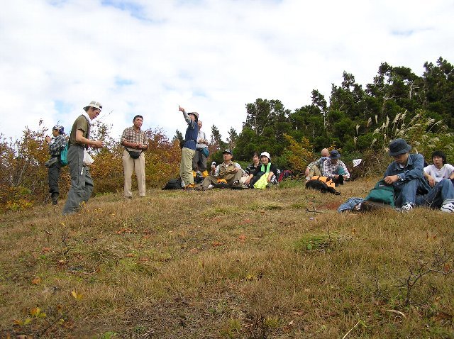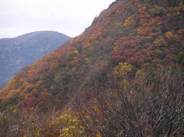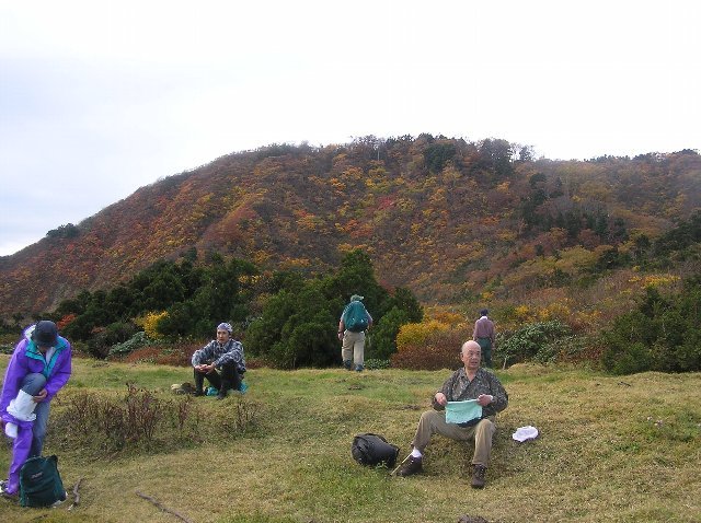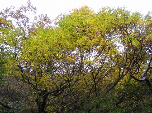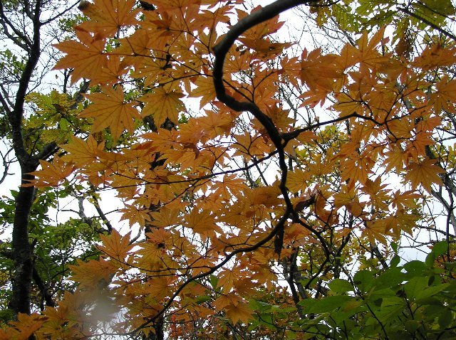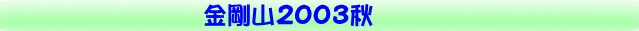 5分歩くと細い水路を跨ぐ。道には栗、どんぐり、落ち葉などがいっぱい。9:30〜9: 40 休憩 10:00 この頃から紅葉が綺麗になりだした。紅や黄色のもみじ。 10:10〜10:20 休憩 10:30〜10:45 組上に到着。芝生に腰をおろすと気持ちいい。ツリガネニンジンが咲いていた。 11:25 金剛山頂上に到着。標高962m。両津湾がきれいに見える。おととしの6月にドンデン山から来た時は1日中霧でなにも見えなかった。今回、この大パノラマを堪能できて良かった。記念写真を撮り、着替え。昼食が終わると又雨。 12:00 早々とあわただしく出発。 12:40 雪畑山登山口(分岐点?) 12:48〜13:00 雪畑山頂上に到着。標高1002m。先程までいた金剛山がきれいに見える。頂上は狭く、20人くらいの人が立つのがやっと。 この辺りは道路脇の赤いナナカマドの実と、青いサワフタギの実が目を楽しませてくれた。 13:35 ザゼンソウの群生地。早春にきたら見事だろう。もう来春のために新芽を出している。 13:50〜14:00 休憩 14:25〜14:35 小芝園に到着。広い芝とシャクナゲの木がいっぱい。ここも花の時期に来たら綺麗だろう。目の前に芝尻山が。疲れた脚でここを登るのか。トホホ。 15:15〜15:25 ドンデン池とキャンプ場を右に見ながら最後の尻立山を登りきる。ちょっと休憩。 15:45 終点のドンデン山荘(建設中−平成16年5月オープン予定)に到着。 15:50 車で下山。 16:30 両津港着。