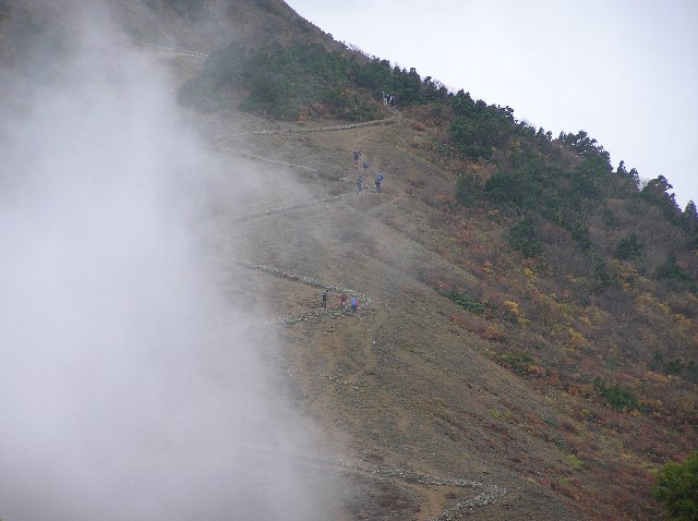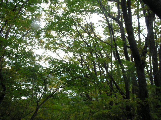8.30 (両津港から登山口まで車で20分位)白瀬登山口出発。いきなりの雨で雨具を着て歩き始める。安物なので汗でビッショリ。 8:55 雨があがり、雨具を脱いで5分休憩。やっぱりレインウェアはゴアテックスと評判。