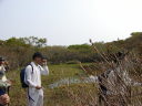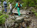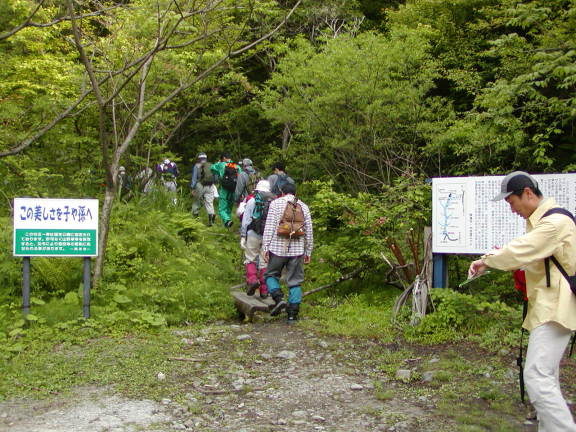 アオネバ渓谷の入り口に到着。準備体操。さぁ期待が高まる。 |