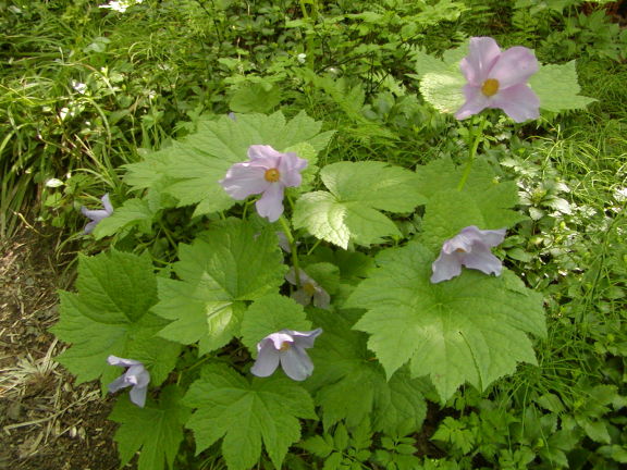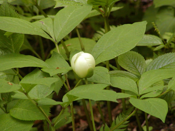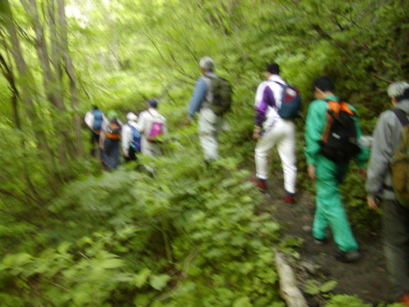 通称アオネバ十字路に到着。標高766M。これできつい登りも終わりと思ってホッとする。ここからしばらくは携帯電話使えます。歩きはじめると、キジムシロ、ヤマシャクヤク、サンカヨウなどが見られた。サンカヨウは深山の幻の名花と図鑑に紹介されていた。 |