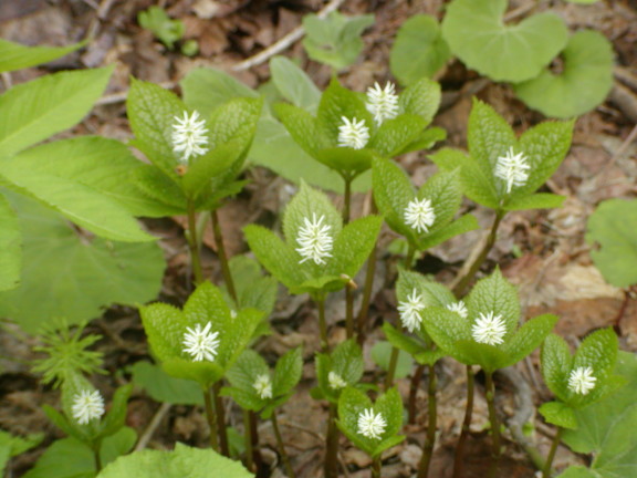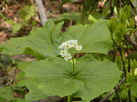 またサンカヨウが見られた。右側にはザゼンソウの群生が少し。ただ、見頃はすぎていた。カタクリもたくさん咲いている。 |