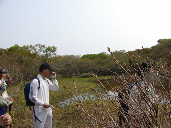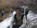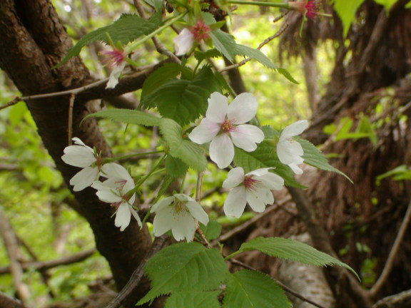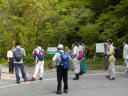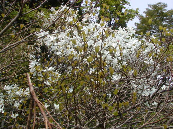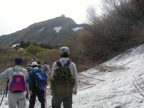 相川町石花から登ってくる、ルートの合流点。24名と合流。両津からの21名とで、総勢45名になった。タムシバが咲いている。 |