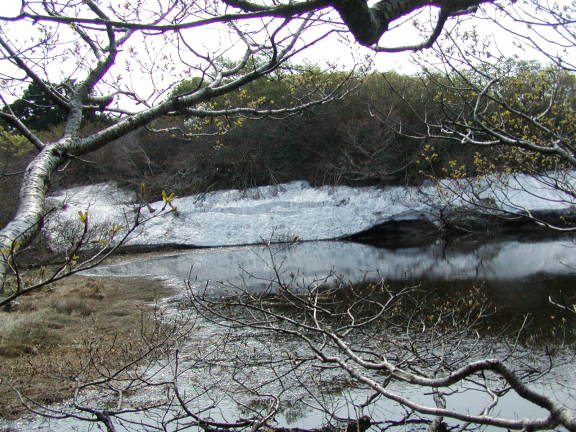 じゅんさ池。池の周りはまだ雪が結構残っている。 |