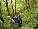 休憩。きつい登りなので、ありがたい。この辺りはシラネアオイはすでに花は終わり。 |