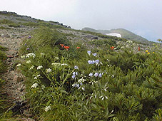 長栂山山頂付近は強風のためか、砂礫地となっており 至る所、白馬浅葱が咲き始めていた |