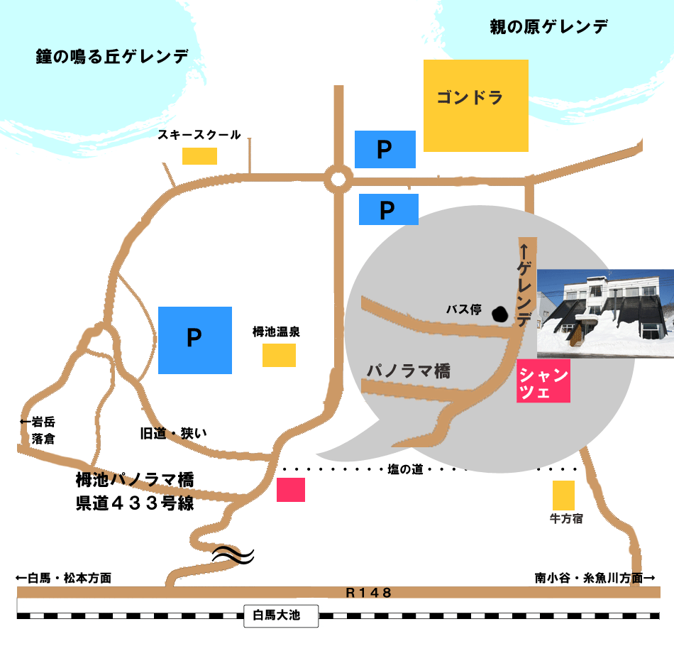 信濃森上セブンイレブン前交差点から、岩岳スキー場前を経由し県道433号線栂池バイパス、パノラマ橋を渡るとすぐです