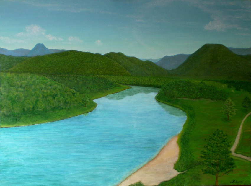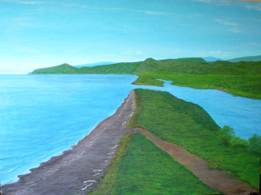 蘆丸の曲に於いてエツラチチと戦ったsanota(砂州或いは砂嘴)からsanputu kotan (川口村)の方角(北)を望んだ視線で描いております。 川にポンピシウンマツの小舟があり戦いの少し前を表現してみました。 |