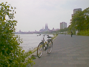 餅ピザを食して5分ほどでライン川に着く。川沿いの道はランナーも多いがローラーブレードも目立ち、