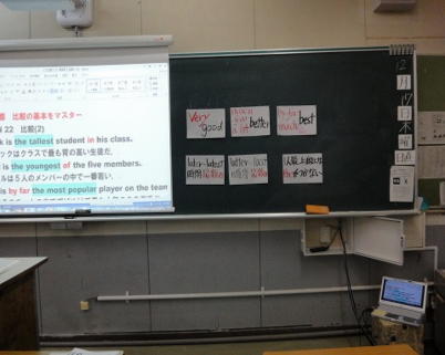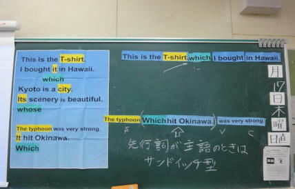 また、関係代名詞の表や重要ポイント、重要例文をワードで作り、模造大の大きさに拡大印刷して、黒板に貼っています。