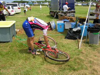 前日の筋肉痛が若干残るなか、「補給母艦」ブロードのシート下にニコン一眼レフと三脚を入れ、この7月に急遽調達したニコン製デジタルカメラもウエストバッグに収納して、油谷湾にほど近い会場に着いた私が見たものは、MTB好きならば感涙モノの素晴らしい光景でした。