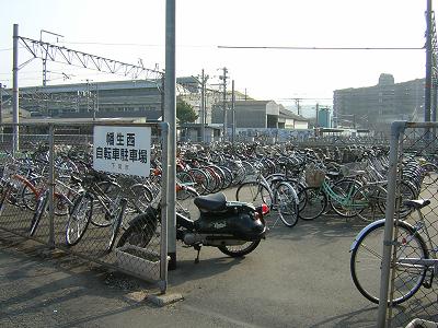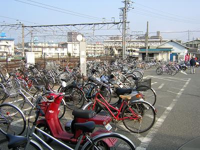 昭和50年代後半に設置された屋根付き部分と、最近になって拡張された更地部分に分かれています。このうち更地部分は仮設扱いなのでしょうか、白線を引いただけ。しかも改札口から3分近く離れており、常駐管理もないことから預ける身としては不安だらけ。当然の帰結として、写真のとおり通路部分や玄関前に停めたくなるのが心情というものです。近くの高校へと通うための逆利用が意外に多く、また大工場も付近にいくつかありますから、都市型レンタサイクルを導入すればヒットすると思いますが。