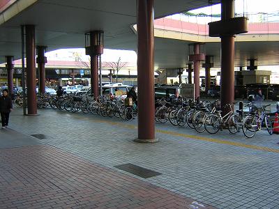 自転車用ラックが合計200台分ほど用意されていますが、このエリアだけで需要は軽く1,000台近くに達します。つまり明らかに供給不足が生じているわけで、収容しきれない自転車は新幹線口の東西各玄関の周囲を、それこそ取り囲むように埋め尽くしています。駐車場ばかり作っていないで、さっさと多層式のゴージャスな駐輪場を増設すべきところ。これでは自転車の活用もままならず、地区の人口が増大を続けても乗客数の減少は避けられません。ただ、ここはバス利用者も多いところなので、バス会社にも駐輪場の設置費の一部を負担してもらうことになるでしょう。