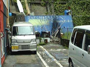 「ゴルフに悩める凡人たちへ」 と題した檄文発見! 新たなる練習方法が開発されたのか!? 私はゴルフをやらないが、 やってて、しかも悩んでたとしても、 この看板を見て話しを聞いてみようと言う気は 起こらないが、どうか!! しかも、何かがもったいないらしい・・・・