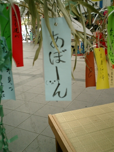 街のアーケードに、七夕の笹飾り・・・・・・ 子供たちか書いた短冊が、たくさんかけてあります。 で、こんなのが・・・・ ↓ Σ(°∇°;) 「あぼーん (・д・)」 って!!! ナニがあったの????? この子の望みは何なの??????