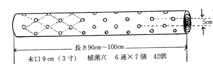 | | 植菌は出来るだけ原木が乾かないうちに行なうことが必要である。玉切った原木を、長期(1ケ月以上)保管する際には直射日光、強風による乾燥を防ぐため農業用シートで包み、その上をコモで覆って保管する方法が有効である。植菌は乾燥しやすい小径木・薄肌の原木から植菌することが望ましい。 |