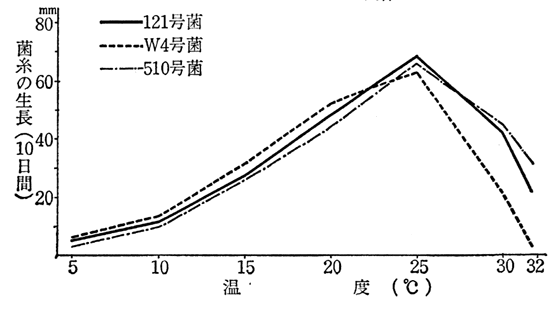 また、トリコデルマと椎茸菌糸の措抗現象を調べてみると、25℃においたものは椎茸菌糸はある程度トリコデルマに侵されずに勢力を保っているが、30℃以上の所へおかれたものはどの品種においてもトリコデルマに侵害されやすいので、トリコデルマの第1の防除方法は榾木を30℃以上の所へ長時間おかず、なるべく涼しい所で管理し椎茸菌を弱めさせないようにすることが大切だと思われる。