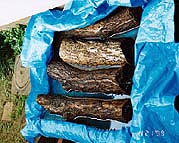 プールに漬ける | 99年4月19日シートで作ったプールに4本の榾木を漬け、48時間後の21日引き上げた。あまり一時に沢山取れても処置に困るので、少し間隔を開けて芽出し、収穫をして行く予定である。