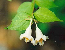 本年枝の先端に淡黄色の花を2個ペアーで付ける。花冠は2〜2.7センチの筒状鐘形で、内側には黄赤色の斑紋がある。2個がベアーとなって咲くのはスイカズラ科の植物の特徴で、このコーナーにも紹介しているウグイスカグラも同様である。