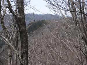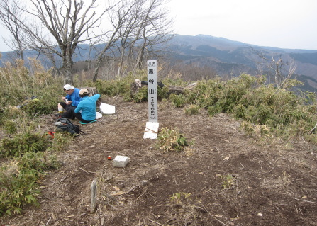 通信小屋の横に立つと、正面に木立を透かして県境の山並みが見えた。県境は壁のように立ちはだかっていたが、その稜線はなだらかで、そこに赤谷山の山頂が少し尖って乗っていた。