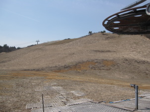 さらにゲレンデを登った。一本のリフトをくぐると、緑色の屋根のロッジの上に出た。そこから二本のリフトの間を真っ直ぐに登った。地面のササは、よく足を滑らせた。