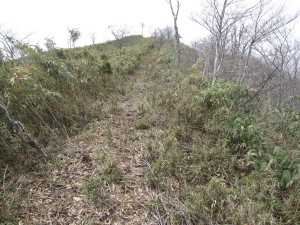 ブナやミズナラの下に、チシマザサが現れ始めた。山頂から下ってくる10人くらいの一行にすれ違った。チシマザサが大きくなり背を越すようになると、県境尾根に出た。