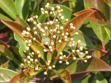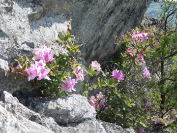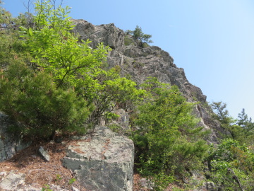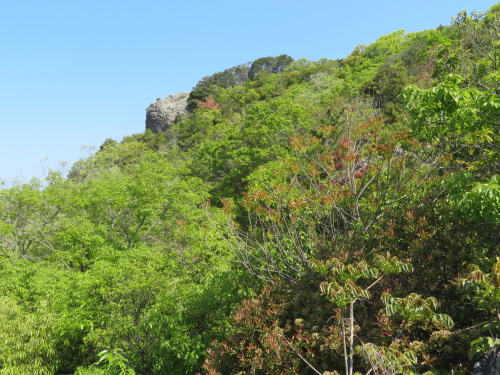 岩の後ろには、木々の樹冠が迫っていた。アカマツは、新しい枝先に開花した雄花をたくさんつけている。カナメモチが、サンゴのように枝分かれした先端に丸いつぼみをつけている。ウラジロノキは、白く粉を吹いたような若葉を広げようとしていた。