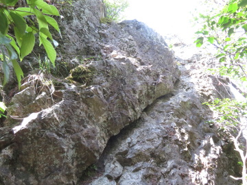 尼子の大岩は、山頂を西にわずかに下ったところにあった。ちょうどいい具合に割れ目が斜めについていて、この割れ目に沿って登ることができる。