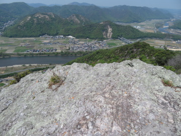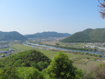 眼下には千種川が大きく湾曲して流れ、その両側に田んぼや住宅地の広がる平野をつくっている。平野の向こうには雄鷹台山や高山や高雄山などの山々。南に目を移すと、坂越の集落の上に播磨灘が淡い水色で広がり、家島諸島の島影がうっすらと浮かんでいた。