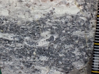 岩石は流紋岩質の溶結凝灰岩である。暗灰色~淡灰色であるが、風化すると褐色に変化する。一部で火山礫に富むところが見られた。 左の写真は、尼子山山頂付近の溶結凝灰岩である。大きさ1mm程度の石英の結晶に富んでいる。長石は変質している。有色鉱物は観察できない。軽石や火山ガラスが引き伸ばされた溶結構造が明瞭である。 |