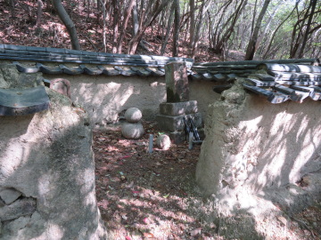 山頂には尼子神社が建てられている。一対の灯篭や狛犬の奥に簡素な社殿。社殿の後ろや左には土塀の跡が残っている。社殿の右の境内に三角点が、ほとんど地中にうずもれるようになって頭だけを出していた。