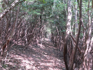 落ち葉と木の幹の茶色、常緑樹の葉の濃い緑に囲まれたトンネルの中の道を進む。朝の木漏れ日が気持ち良い。