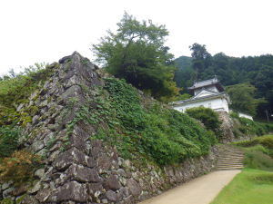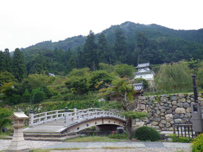 出石城跡と有子山城跡 谷山川に架かる太鼓橋を渡り、登城門をくぐって石段を登った。下郭、二の丸の石垣が整然と積み上げられている。雲を透かして降りてくる光を、復元された隅櫓の白壁がまぶしくはね返す。 出石城は、慶長9年(1604)、小出吉英によって有子山城を廃してそのふもとに築かれた。 広大な御殿があったという二の丸跡を横切り、反対側の坂を登ると本丸跡に出た。サクラやモミジやサルスベリの木が散らばる庭園風の本丸跡には、後にこの地を治めた仙石氏の藩祖を祀る感応殿が建ち、その前に「出石そば発祥の由来」の石碑が新しく設けられていた。 北を区切る白い塀に開けられた丸や三角や四角の鉄砲狭間が、要害であった往時を偲ばせていた。 本丸跡から、苔でおおわれた石垣の下を登った。石垣に沿った堀を、水が足早に流れ落ちていた。 立ち並ぶ朱の鳥居をくぐると、稲荷郭に達した。大きなスギが何本も立つ広場から、眼下に出石の町が一望できた。午前9時の出石の町は観光客もまばらで静かだった。近くの森からイカルの声が渡ってきた。