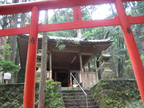 鳥居をくぐり、ヒノキ林の下の苔むした道を進んだ。谷の奥まで行くと、小さな赤い鳥居がいくつも立ち並んでいた。その先の石段を上ると、河上稲荷神社の社が建っていた。