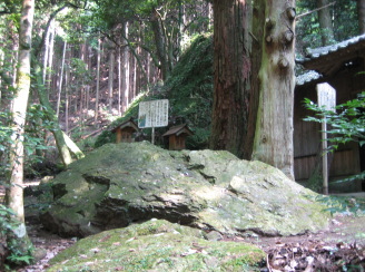 社の左にも、岩が1つ転がっていた。長さ5m、高さ1.5mほどの横に長い岩。これが、「鏡岩」だった。