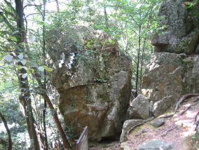 尾根に出たところで、Uターンするように南面をゆるく下ると、道の脇に大きな岩が立っていた。その大岩の陰に立つ高さ5mほどの岩が「ゆるぎ岩」だった。