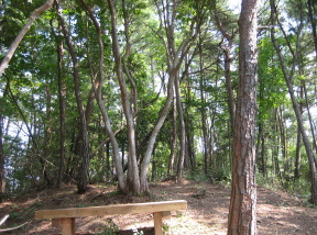 登山道を利用して愛宕山を西へ下り、林道を横切って尾根のやぶに分け入った。Ca.270mの小さなピークまでは、大荒れのやぶ。そこを越えると、尾根の切り開きが次第にはっきりしてきた。尾根には、頭の赤い営林用の杭が続いていた。