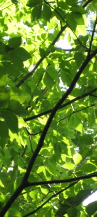 道は急に細くなり、南の尾根に向かってつづらに上っていた。尾根の手前に分岐があって、「ゆるぎ岩」へは、いったんここから下ることになる。ネジキやリョウブの葉が、陽を透かして林内は明るかった。