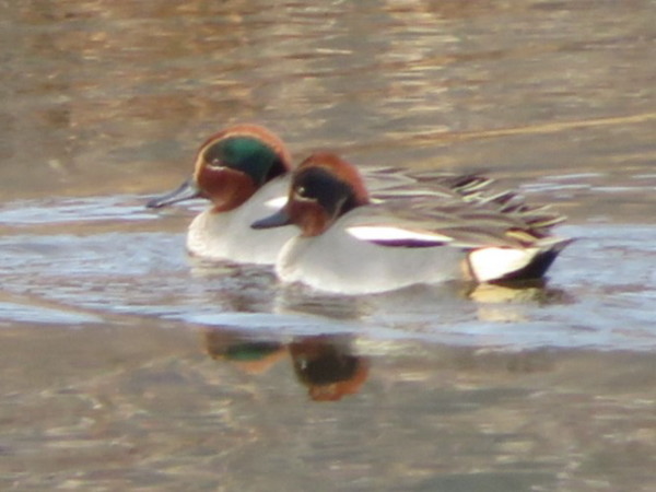 | オスの顔の色は普通は暗緑色ですが、手前のコガモはほとんど黒に近い 色をしています。 |