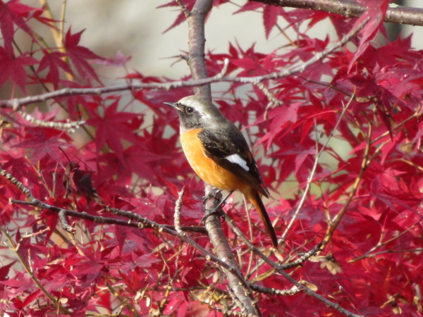 | 真っ赤に紅葉したモミジに止まりました。 銀白色の頭、オレンジ色の胸、翼の白紋が目立ちます。ヒッ、ヒッという高い声にカッ、カッ という音が混じります。 |