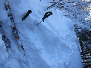 ヒノキ林と雑木林の間に、細い尾根道がついていた。ビンディングのテールを立て、急な坂を登った。一歩一歩スキー板を雪面に強く押し付けないと登れない。息がすぐに切れた。 標高900mぐらいまで登ると、傾斜がさらに急になってもうスキーでは登れなかった。スキーをはずし、スノーシューに切り替えた。スノーシューは、スキーよりさらに深く雪に沈んだ。 ひざまで雪に埋まり、踏み抜くと腰まで雪に没した。スキーを肩にかついだため、ストックも自由に使えず何度も雪の中で倒れた。 20分間雪と格闘し、ようやくこの急斜面を抜けることができた。