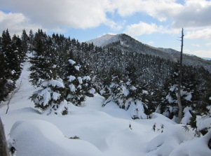 夏道は、標高930mあたりで尾根を離れ、谷をトラバースして国境尾根を目指していた。この道が、雪に埋もれて分からなかった。見当をつけて、スギ林の中へ入り込んだ。 ときどき、スギの枝に積もった雪がドサッと重く落ちた。昼が近く、腹が減ったので、上から雪の落ちる心配のないところを探して、立ったままおにぎりを食べた。 谷を渡り切ってたどり着いた国境尾根を少し下ると、890mコルに出た。コルには雪原が広がり、北側のすぐ近くに始めの林道が伸びてきていた。林道をそのまま進んでいると、もっと早くここへ来ることができた……。 コルからの上りが、また急傾斜だった。ターンを繰り返してジグザグに登ろうとしたが、深雪の急斜面は思うようにスキーが操作できなかった。それでも何とかその傾斜を登り切って960mピークに立った。 960mピークから、雪をかぶったヒノキの木立の向こうに藤無山が見えた。12時半……山頂はまだ遥かに遠い。