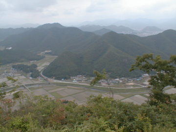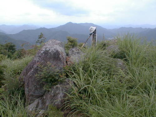 大きな岩塊がいくつも転がった高みが、角尾山の山頂であった。山頂は、眺望が四方に開けていた。東に、光明寺合戦の舞台の一つ引尾山や鳴尾山が座り、その奥に東播磨の山々が、梅雨空に薄く白い稜線を連ねていた。 山頂の岩の上に立つと、街並みや田植えの終わったばかりの田園風景が眼下に近い。野間川が、ゆるやかにうねって流れている。涼しい風が、麓から吹き上がってきた。