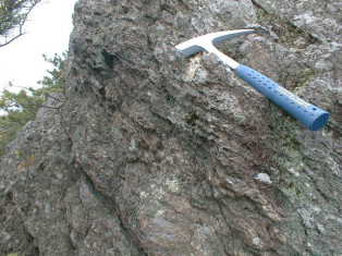 岩石は、流紋岩質の溶結凝灰岩である。石英・長石の結晶片が多く含まれ、黒雲母や角閃石も認められる。基質は赤褐色や灰色をしていることが多い。 表面を観察すると、押しつぶされた火山ガラスが風化して抜け落ちた細長い穴が同一方向に並んでいることがあり、溶結凝灰岩であることが分かる。 全体的に風化が進んでいる。また、尾根上に露出する岩盤は、珪化していることが多い。 |