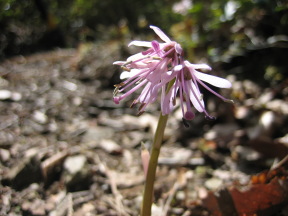 鉄塔から、尾根上に道が開かれていた。新緑萌える雑木の道。ショウジョウバカマが咲いていた。